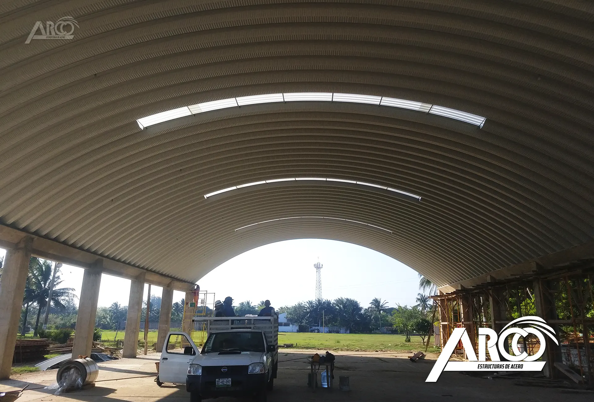 Fabricación y montaje Arcotecho con lámina Arcoestructura K-02 en calibre 20 de marca Ternium con láminas traslúcidas Stabilit Acrylit G-10.