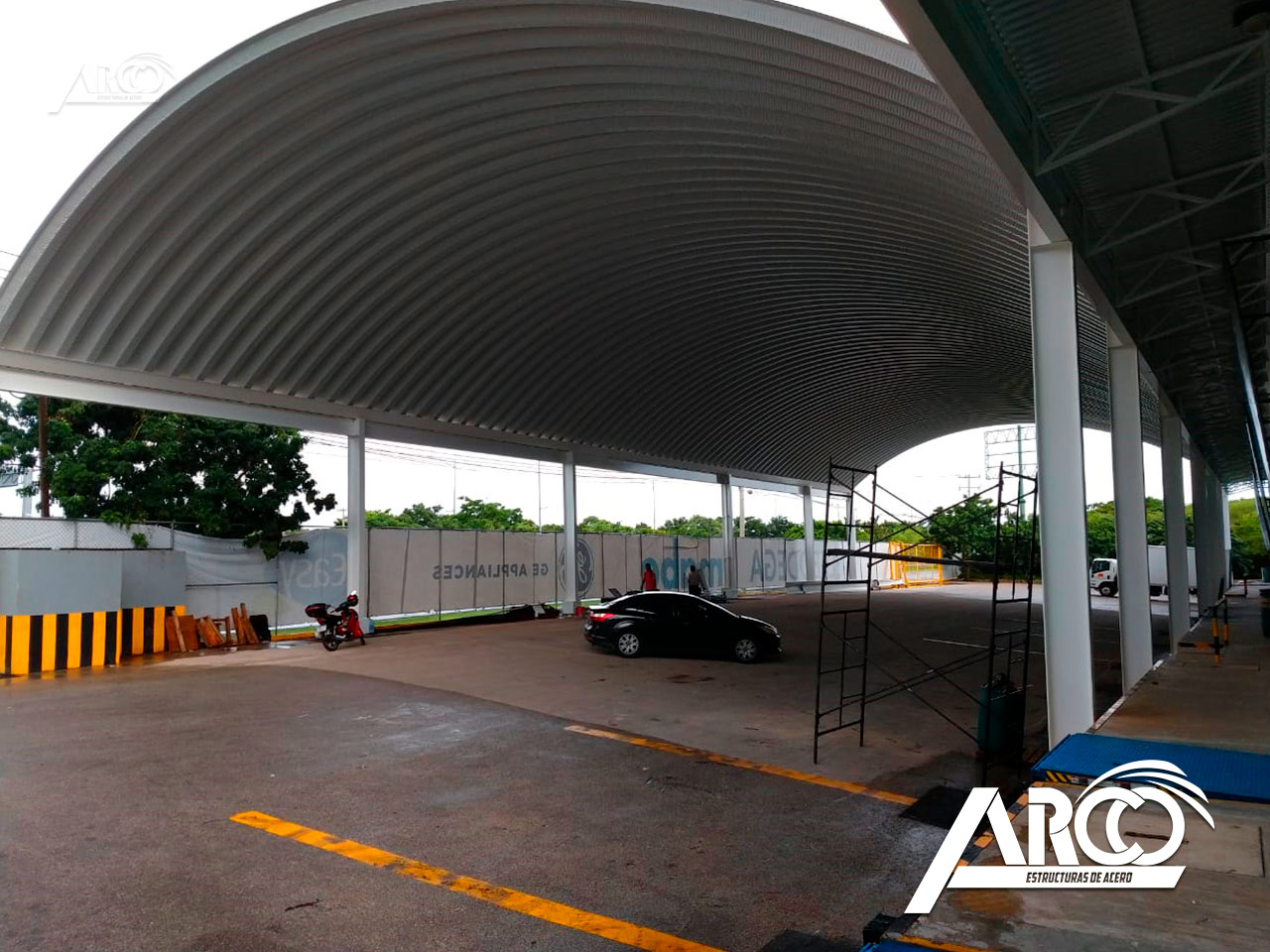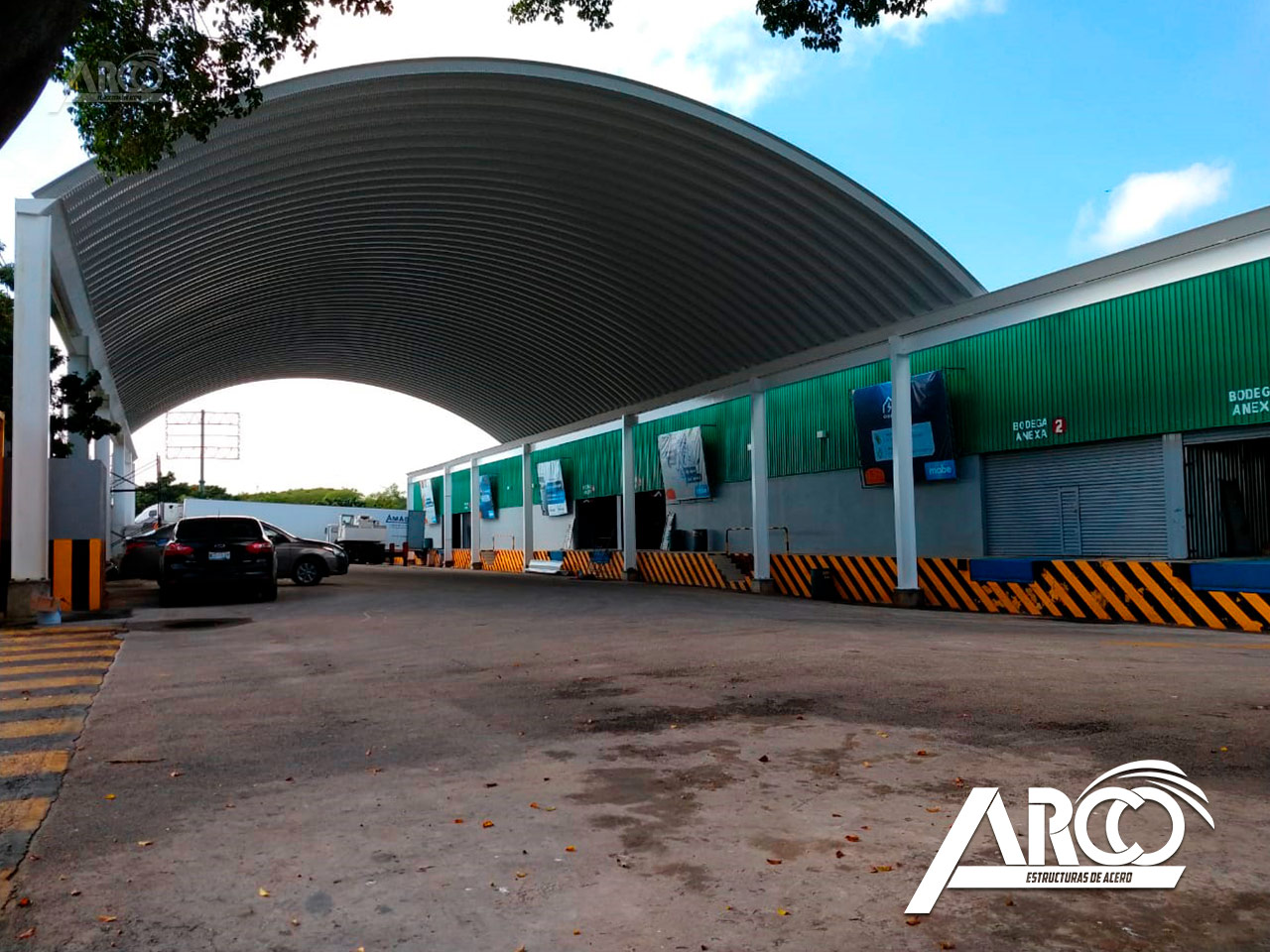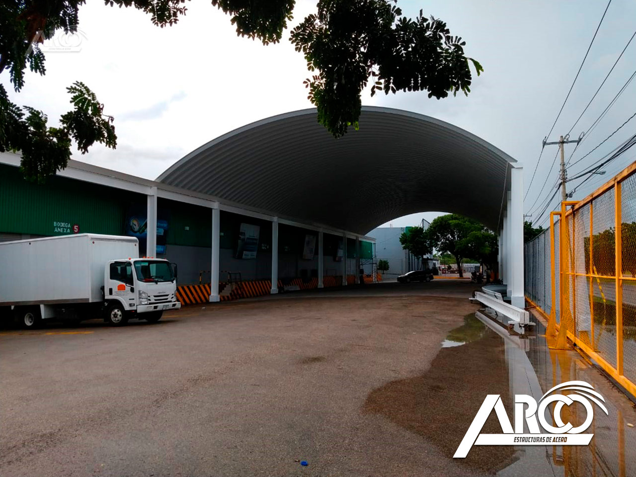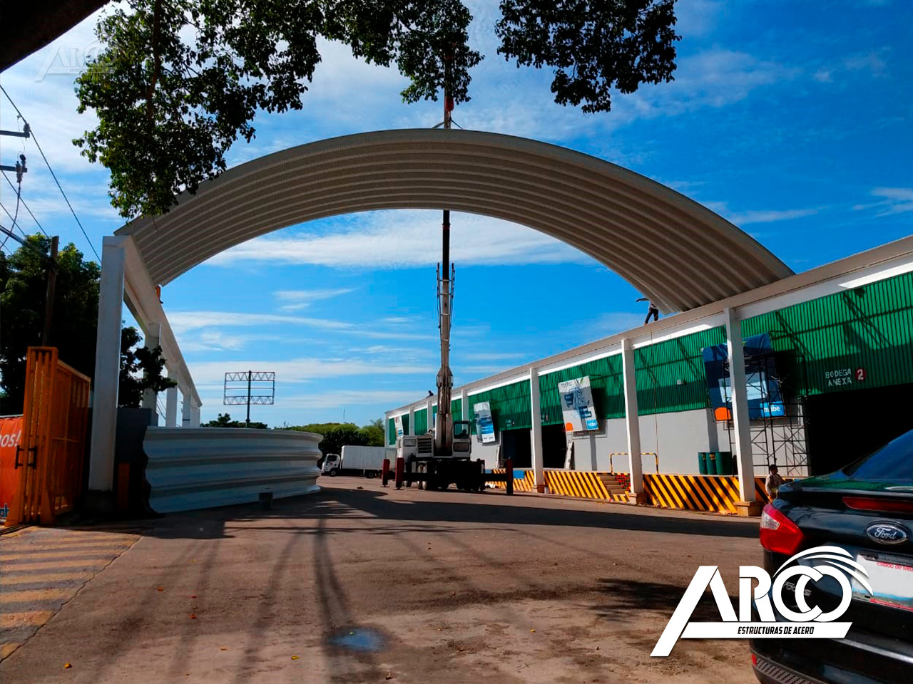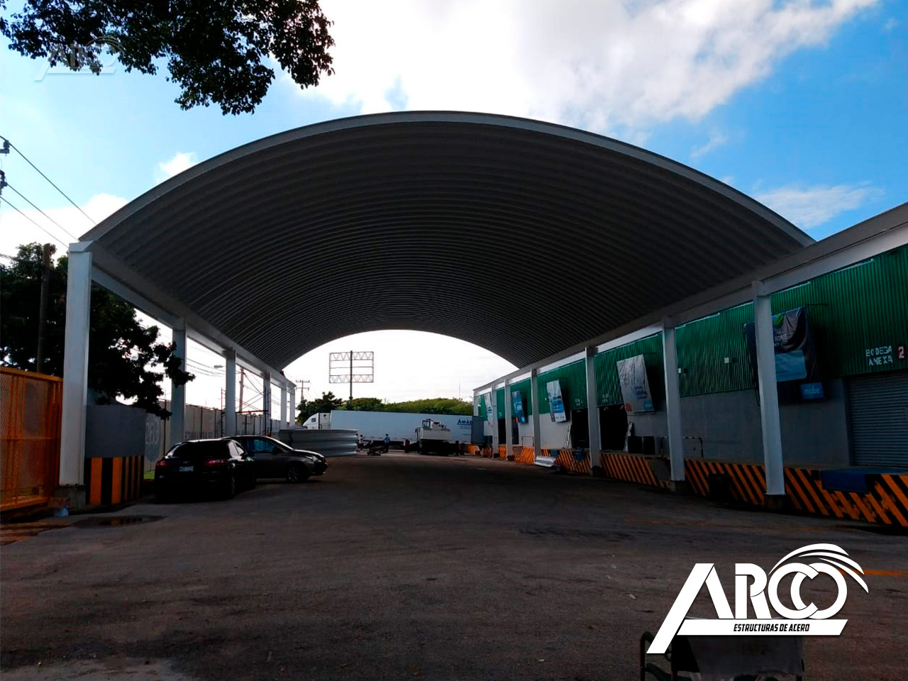 Cubierta en calibre 22 en acabado Pintro Alum. El arcotecho fue fabricado para cubrir un claro de 20 m con una flecha del 20%.