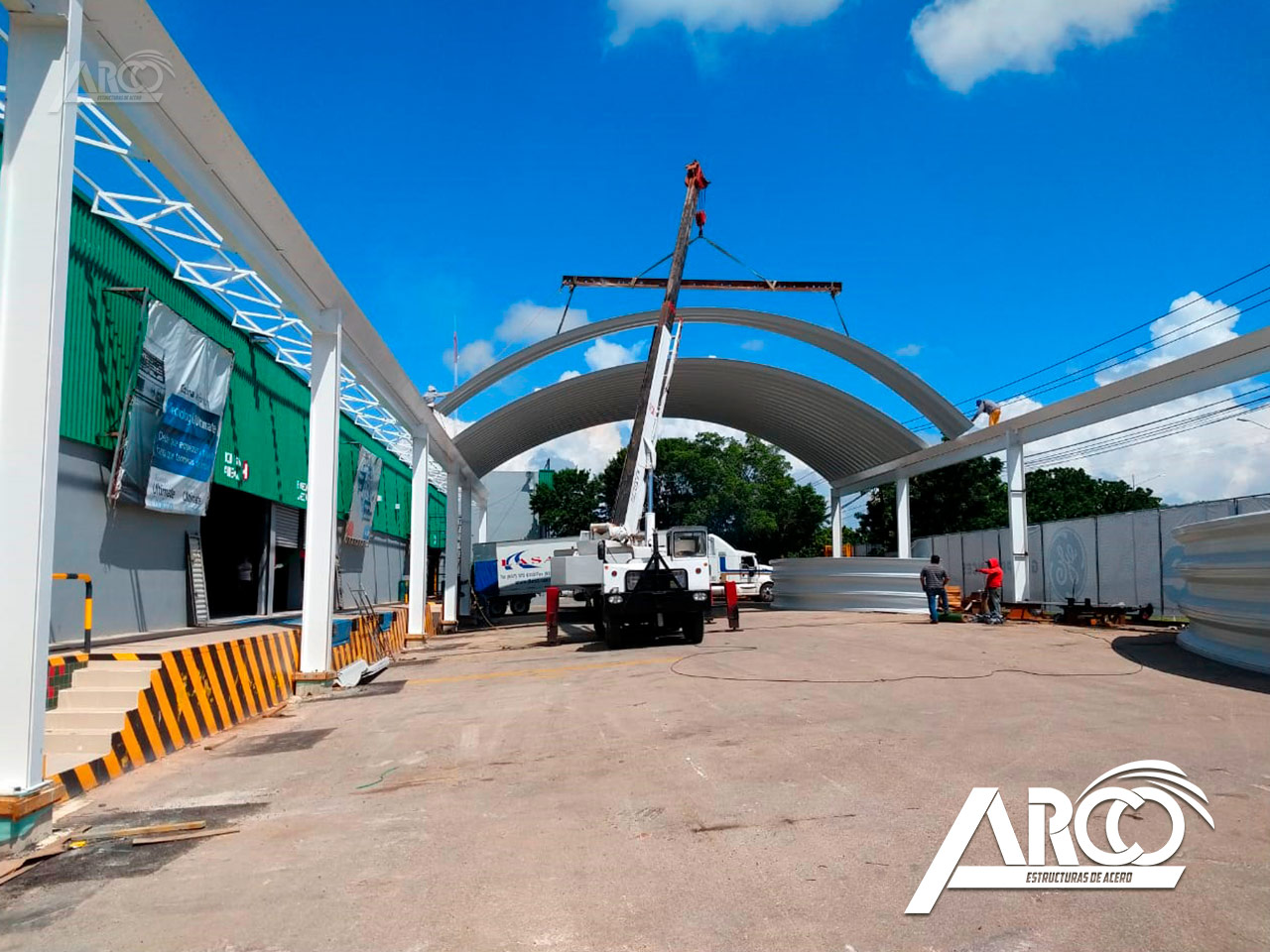 Las cubiertas de arcotecho se instalan con la ayuda de una grúa telescópica. Se se engargolan 3 módulos arcos con la intención de agilizar la instalación. Se pueden instalar hasta 1,000 m2 por jornada.