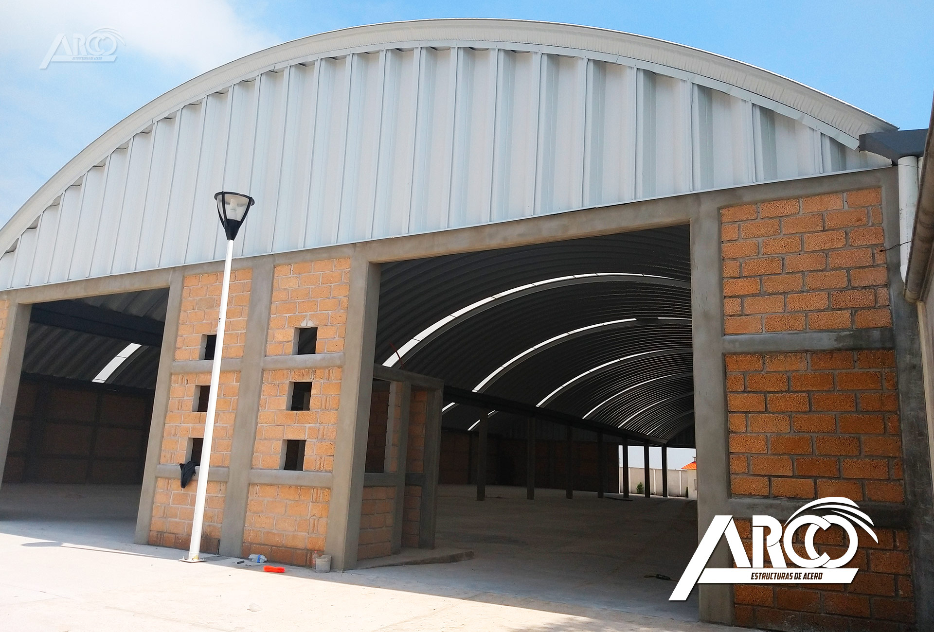 Cubierta en calibre 22 en acabado Pintro Alum. El arcotecho fue fabricado para cubrir claros de 25 metros con una flecha del 20%.